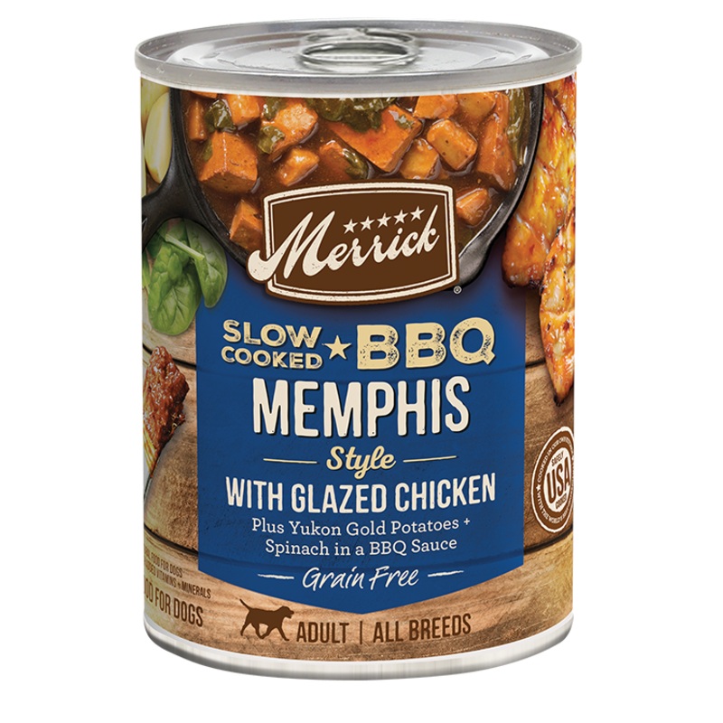 Merrick Grain Free Slow Cooked BBQ Memphis Style with Glazed Chicken Dog Food is formulated to meet the nutritional levels established by the AAFCO Dog Food Nutrient Profiles for maintenance.