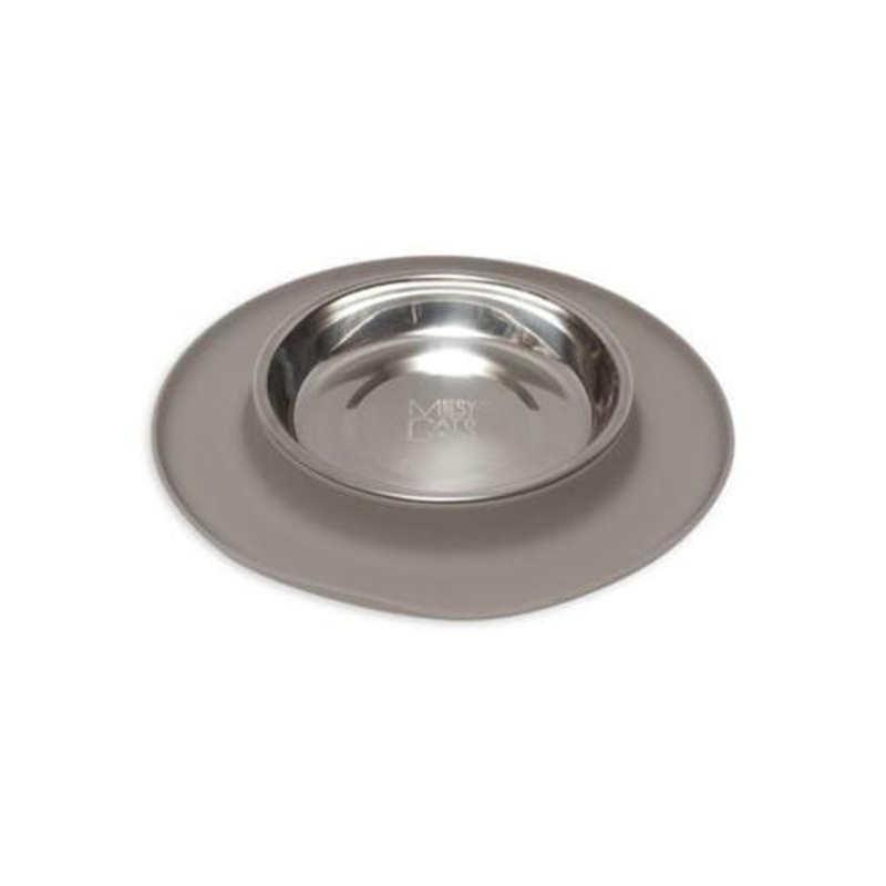 Messy Mutts Silicone Feeder With Stainless Saucer Shaped Cat Bowl-Grey 14 oz