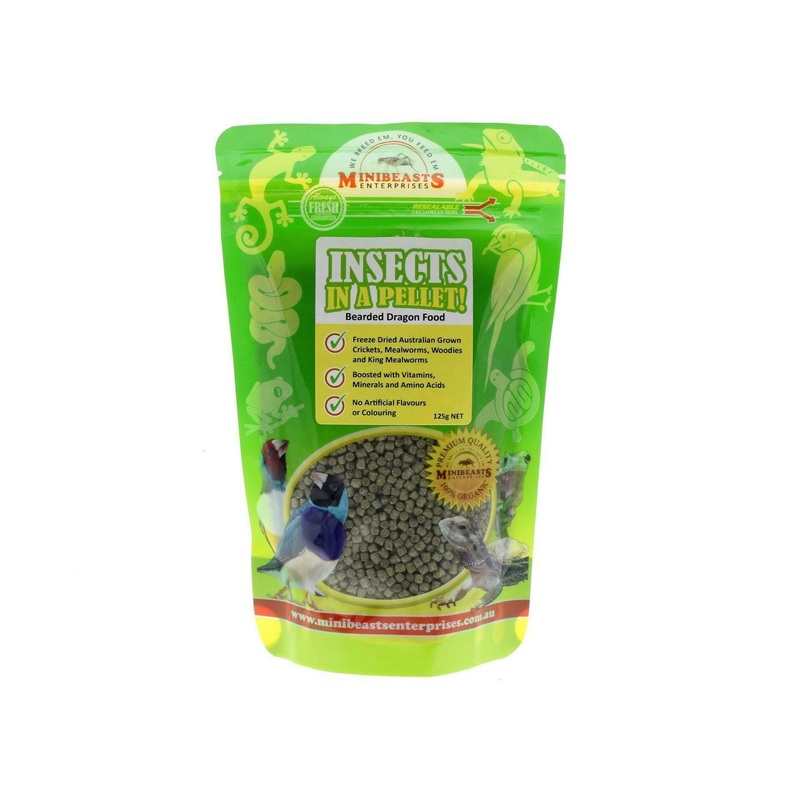 Insects in a pellet! A complete balanced, palatable and nutritional diet for your Bearded Dragon. Packed withMinibeasts own grown crickets, mealworms, woodies and king mealworms.Minibeasts then freeze dry these and use as the primary protein source and add