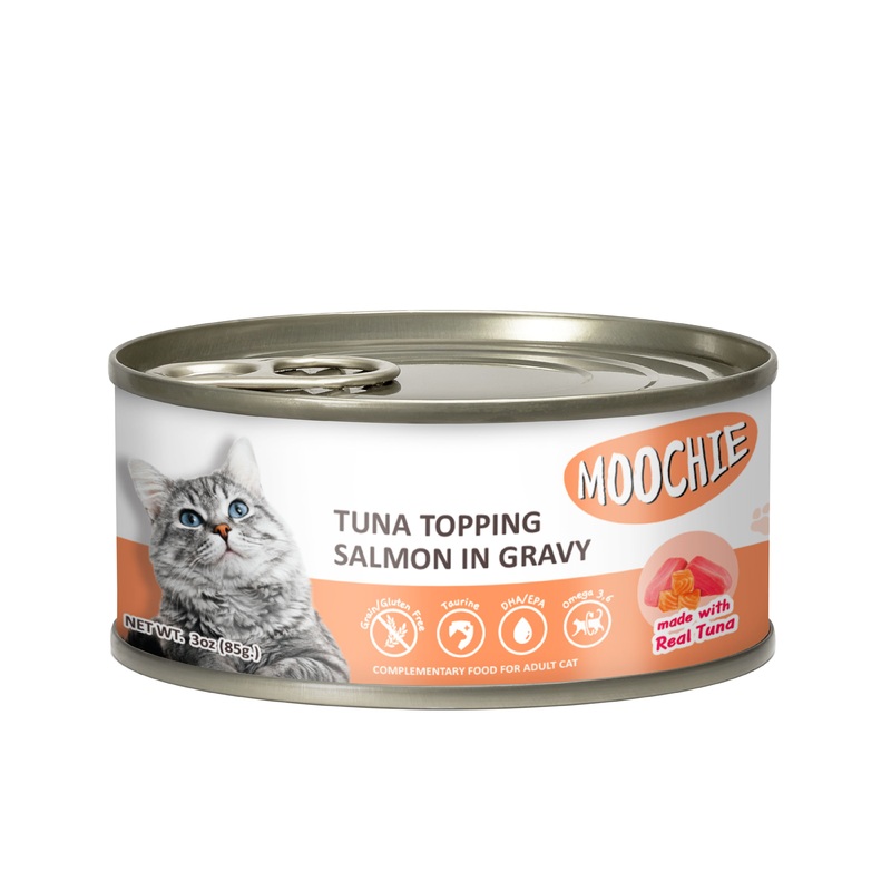 Moochie Adult Tuna Topping Salmon is a high-quality cat food that comes in an 85g can. This recipe features real tuna as the primary ingredient, along with succulent pieces of salmon.