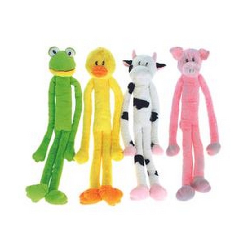 Our Swingin' Slevins have extra-long arms for pups who love a good tug of war game. Super plush and soft, each has multiple squeakers. Comes in pig, cow, frog, or duck.