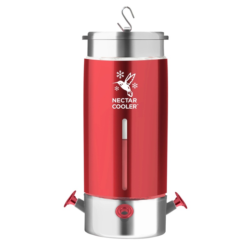 Screw on stainless steel top with ant moat & hanger, insulated double wall construction with interior glass liner keeps nectar cooler, small thin window to see nectar level, powder coated stainless steel ports prevent rust. Nectar Capacity: 30oz.