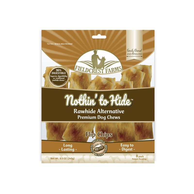 Description Chew MeterIngredientsGTD AnalysisNothin to Hide Peanut Butter Flip Chips 8 Pack Bag are a natural and highly digestible alternative to rawhide. Made with beef, sweet potato, and natural peanut butter flavor, these twist stix fulfill your dog's