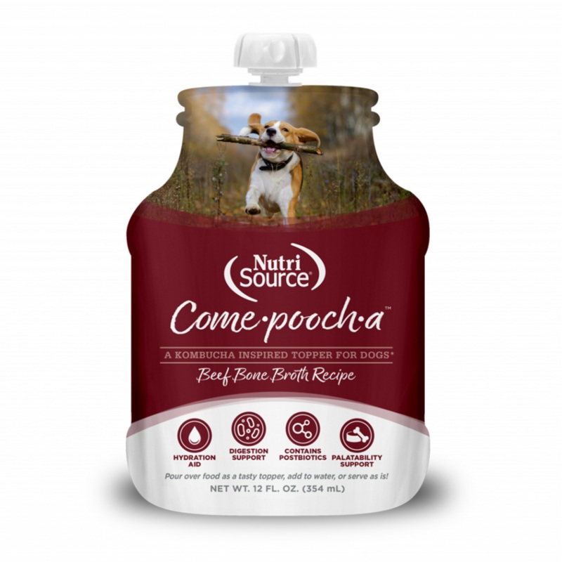Show your pooch some love with a dose of nutritious and delicious NutriSource Comepoocha Beef bone broth. A Kombucha inspired topper for dogs. Pour over food as a tasty topper, add to water, or serve as is for hydration and palatability support. Support digestion with natural postbiotics from fermentation products. Formulated with Alltech ingredients made exclusively for NutriSource. Family owned means we make decisions based on whats best for your family pets!
