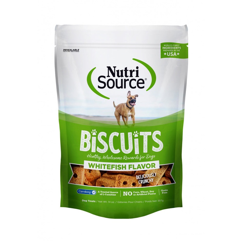 Made with high quality ingredients as well as added vitamins and minerals, NutriSource Grain Free Whitefish Biscuits Dog Treats are the perfect reward for your pup! These crunchy treats are made with real fruits and vegetable as well as fresh fish! NutriSource Grain Free Whitefish Biscuits Dog Treats also have L-Carnitine to help your pup burn fat.