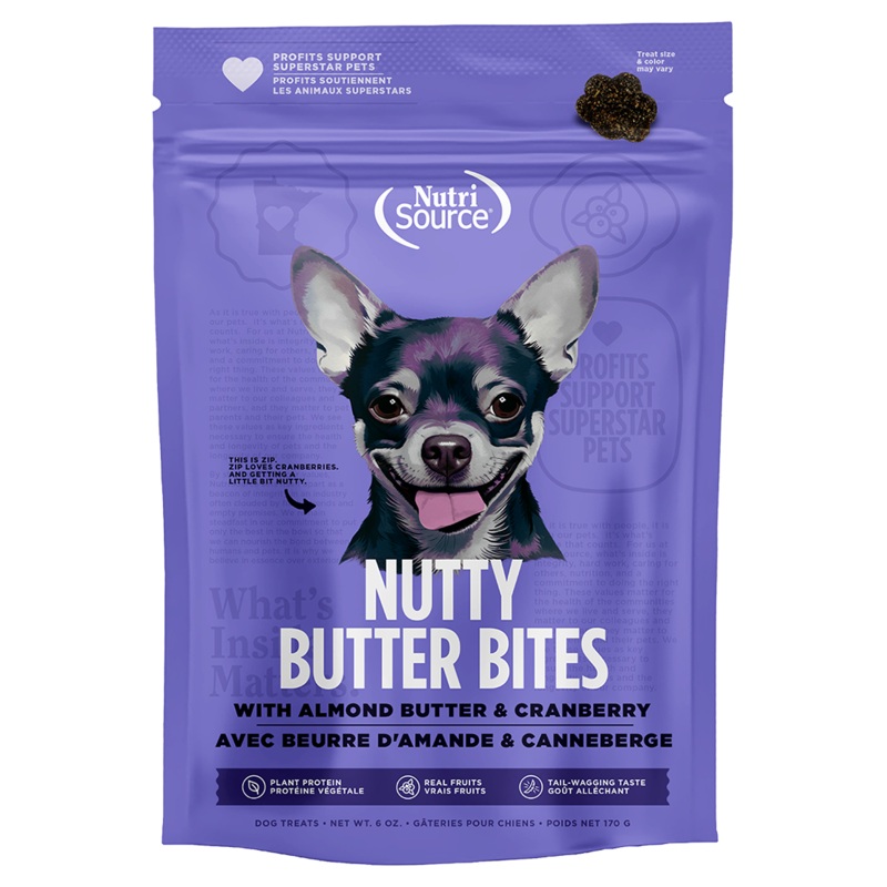 - NutriSource Almond Butter & Cranberry Nutty Butter Bites are made with high-quality plant protein.