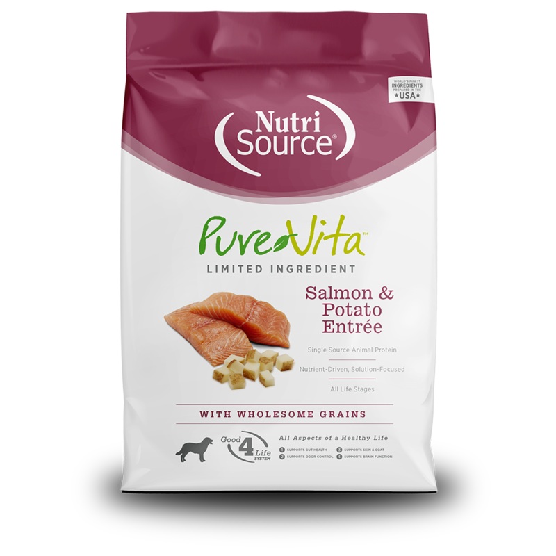 - As a member of our grain inclusive series of dog foods, NutriSource Pure Vita Salmon & Potato Entre is formulated to meet AAFCO guidelines for all life stages.