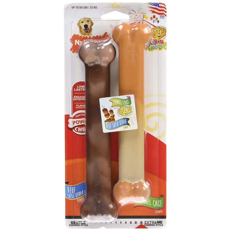 Every since creating the world’s first nylon chew toy in 1955, Nylabone has been the leader in the pet industry and continues to help dogs safely satisfy their natural urge to chew. Intended to challenge the most aggressive chewers, this Power Chew twin pack contains two durable chew toys made of sturdy nylon. Each chew toy offers long lasting entertainment and promotes dental health, giving your dog two fun ways to stay busy and help maintain clean teeth. The chew toy comes in a natural bone shape that dogs love. The Flavor Frenzy dog bone chew toy features savory flavor throughout and includes dental nubs and ridges to help reduce plaque and tartar buildup through chewing action. These tough chew toys for dogs are proudly made in the USA and will provide your best friend twice the chewing excitement!