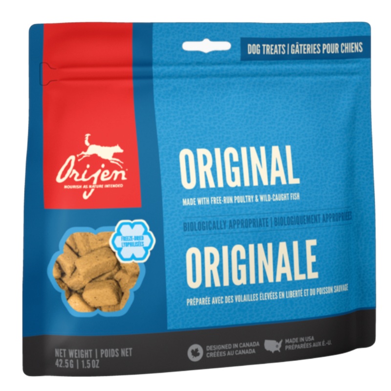 ORIJEN Freeze-Dried Treats are crafted with the same quality ingredients that make uptheirtrusted foods. This Original recipe is made with raw free-run chicken and turkey, and wild-caught fish that are gently freeze-dried to lock in their rich nutrients, f