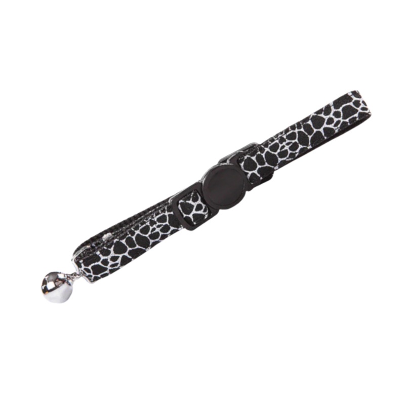 This elegant black-and-white collar features a marbled pattern and a matching bell, blending style with safety.