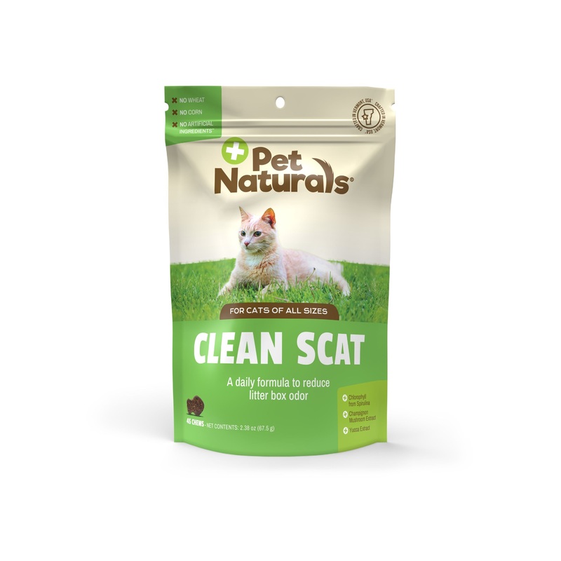 Clean Scat is designed to reduce fecal odor in cats and freshen their breath with a tasty chew that cats love! Clean Scat features Champex brand Champignon Mushroom, which is extensively studied for its ability to suppress odor-causing chemicals in the intestines.These delicious chews also contain Yucca and spirulina to deodorize while supporting toxin removal. With Clean Scat, your cat will have fresher breath and a fresher litter box!