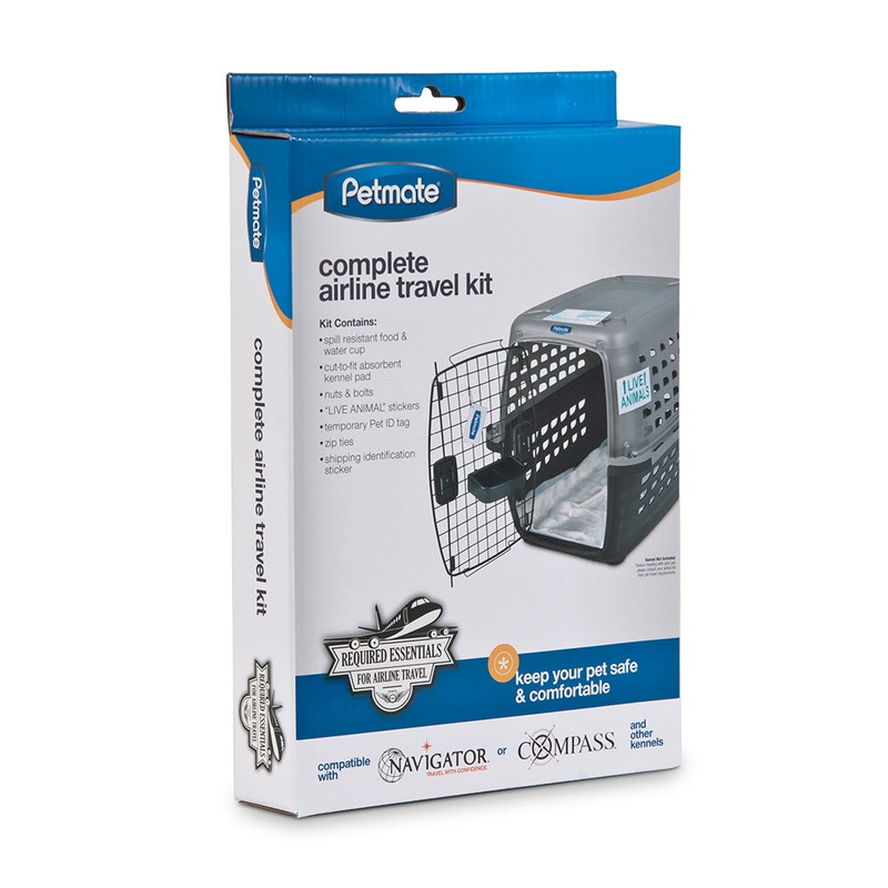 The Petmate Kennel Airline Travel Kit for has everything you need to ensure safe travels for your pet and to make traveling easier for you. This travel kit contains a spill-resistant food & water cup, an absorbent kennel pad, two Live Animals stickers, a temporary Pet ID tag, a shipping identification sticker, 12 zip ties, (12) 1 1/4 inch bolts, (5) 1 3/4 inch bolts, (5) 1 inch bolts, 12 washers, and 12 nuts. Many airlines do not accept plastic kennels with plastic nuts/bolts or “pegs” that hold the top and bottom together. This kit includes metal nuts/bolts to modify your kennel. Before traveling with your pet please consult your airline for their pet travel requirements.