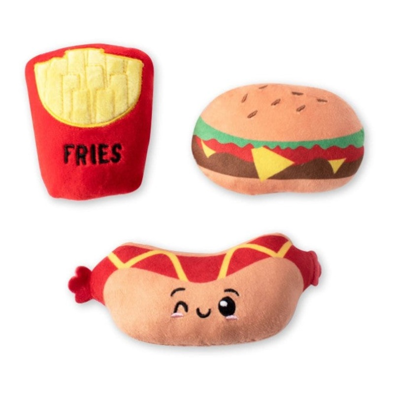 I'll take fries with that! Our"Fast Foodies"3 piece mini plush toy set is perfect for the pup that likes to play all day. With each toy stuffed with fluff and a loud squeaker, this trio is is sure to be love at first bite.Great for small dogs and not inten