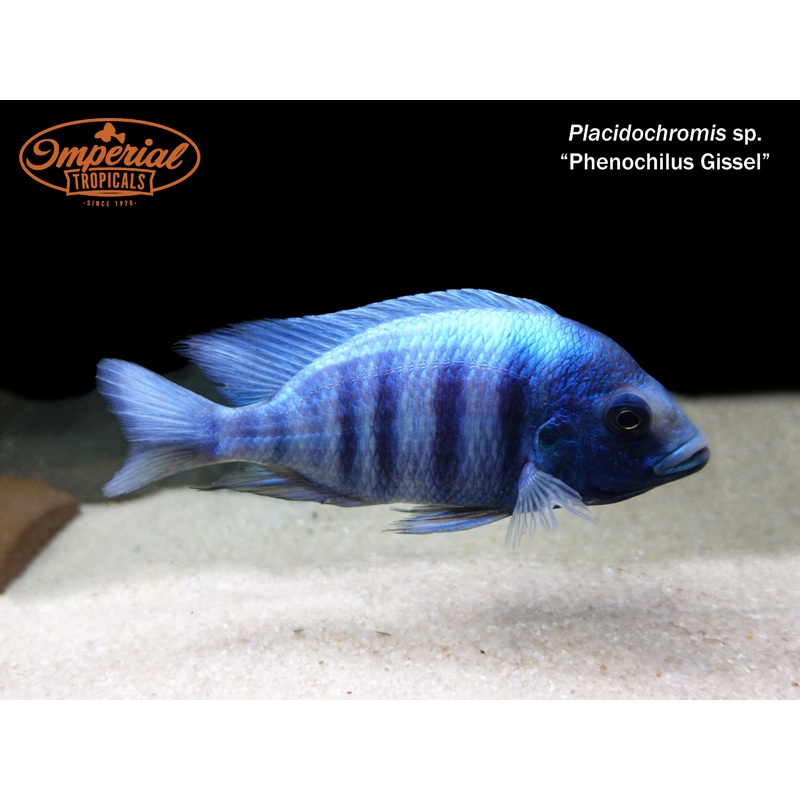 Remarks: A harder-to-find cousin of one of our favorites, the Star Sapphire, is Placidochromis sp. Phenochilus Gissel. These larger Haplochromines lack in the blue speckled “chips” that the Sapphires sport, but they make up for it in their unique body colors – a gorgeous blue-green aquamarine. Their stripes may still be visible until full maturity, but the wait is well worth it. Juveniles begin developing colors around 2″, and females retain a remarkable amount of this color compared to many African cichlids.