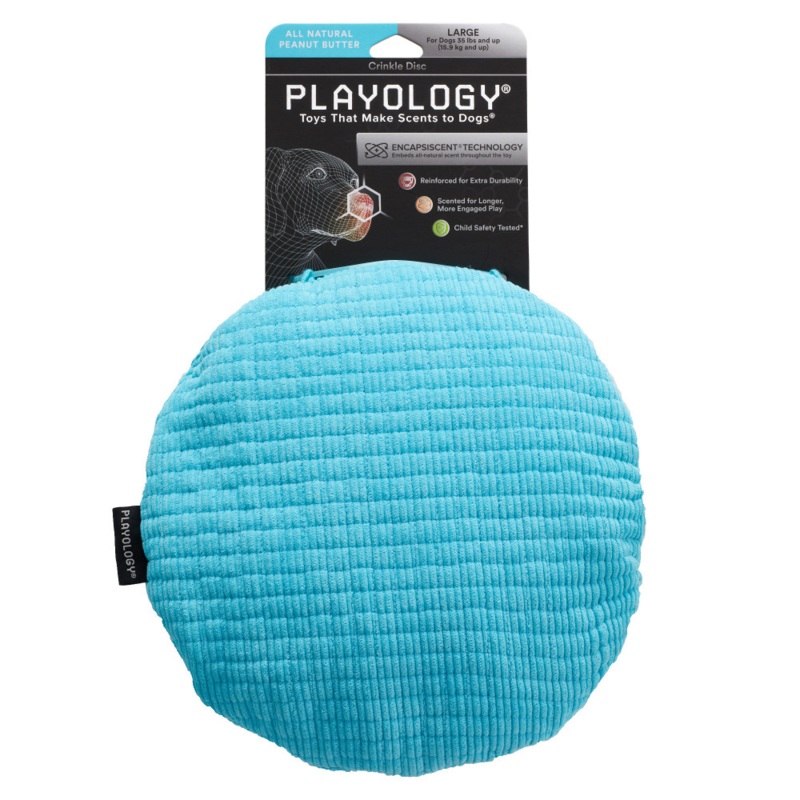 The Science of Scent Unleashed! Playology designs scented toys made from dog-safe materials that keep dogs engaged longer 7X as long as an unscented toy. Our Plush Crinkle Disc features an enticing scent, engaging crinkle, and reinforced durability to make play sessions exciting and long-lasting. It is suitable for dogs of all ages and is great for interactive play and fetch. Available in one size and two mouthwatering scents allowing you to find what suits your dog’s taste.