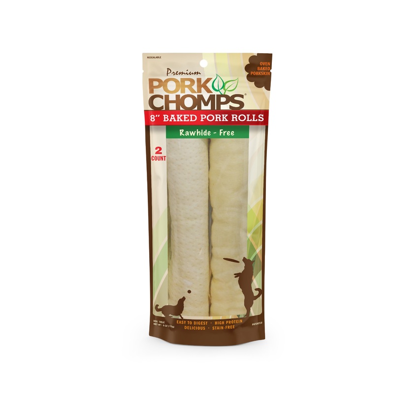 Premium Pork Chomps 8 Baked Rolls are fully digestible and the perfect rawhide alternative for your pup!! Pork Chomps are made from baked pork skin creating a healthy, low fat, high protein dog chew. This wholesome chew is made with limited ingredients, fr