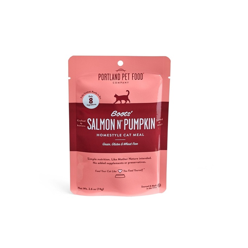Portland Pet Food Salmon Pumpkin 2.6ozBoots' Salmon N' Pumpkin is a simple wholesome meal made with Omega-3 Rich Northwest Salmon and slowly cooked in small batches with only 8 natural ingredients.Rescued as a kitten, Boots was always grateful for the warm