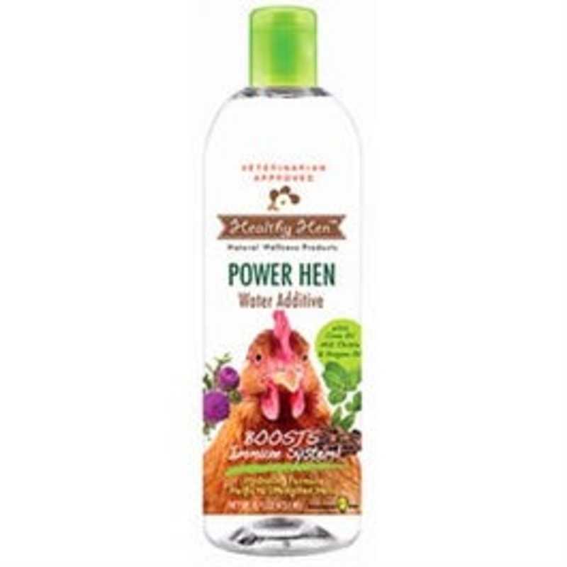 Power hen, 16 oz, water additive, natural formula that helps maintain a healthy flock, active ingredients include: oregano, orange oil, eucalyptus, cinnamon oil, rosemary oil & milk thistle, bottle.