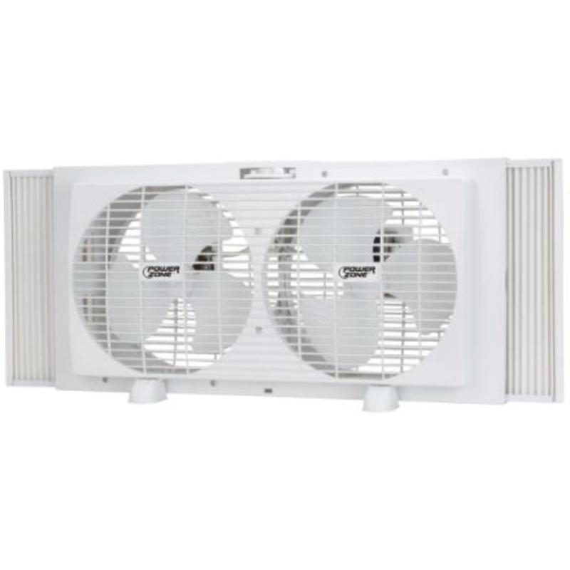 PowerZone Window Fan, 3-Speed, 1029, 1122, 1216, Remote Control, Reversible Blade, 23-1/2 to 35 in W Dimensions, WhitePowerful 2 speed motor for highvolume airflowDual 9" fan heads withintake and exhaustSide panels adjust to fit most windowsEasy-to-use rot