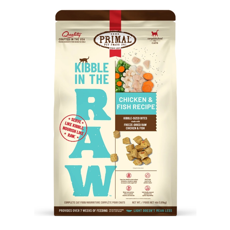 Kibble in the Raw reimagines kibble the Primal way so you can nourish your cats Primal needs.Our Chicken & Fish recipe raw cat food is crafted with cage-free chicken raised without antibiotics, steroids, or added hormones and wild caught fish. It also feat