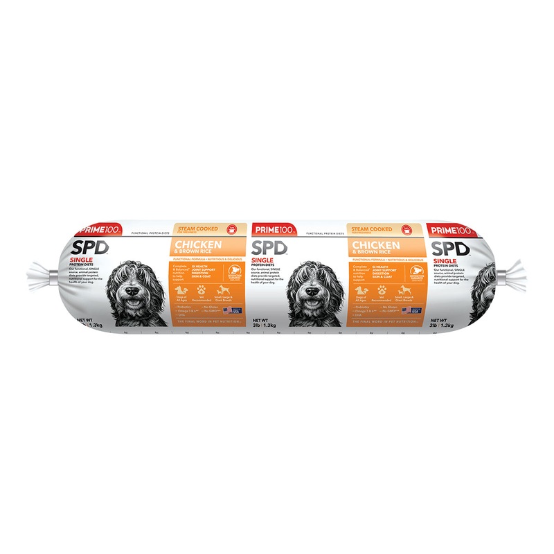 Steam Cooked for Freshness | Prime100 Chicken & Brown Rice is a single protein diet designed for dogs with digestive issues and for gastrointestinal health. Complete and balanced with natural sources of calcium, glucosamine, and chondroitin make this diet suitable for all breeds and dogs of all ages including giant breed puppies. Formulated with added amino acids and essential nutrients for muscular development, and essential fatty acids and omegas for skin and coat health.With added natural digestive enzymes to help improve gastrointestinal health and added functional oils rich in EPA and DHA for optimum bone and joint health. No added artificial colours, flavours, or preservatives.Our functional protein, select ingredient diets are made in small batches and packed raw in their final packaging, then gently steam cooked and allowed to rest for up to 24 hours. Serve straight from your fridge!