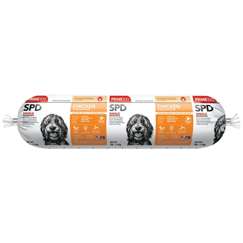Steam Cooked for Freshness| Prime100 Chicken & Brown Rice is a single protein diet designed for dogs with digestive issues and for gastrointestinal health. Complete and balanced with natural sources of calcium, glucosamine, and chondroitin make this diet suitable for all breeds and dogs of all ages including giant breed puppies. Formulated with added amino acids and essential nutrients for muscular development, and essential fatty acids and omegas for skin and coat health.