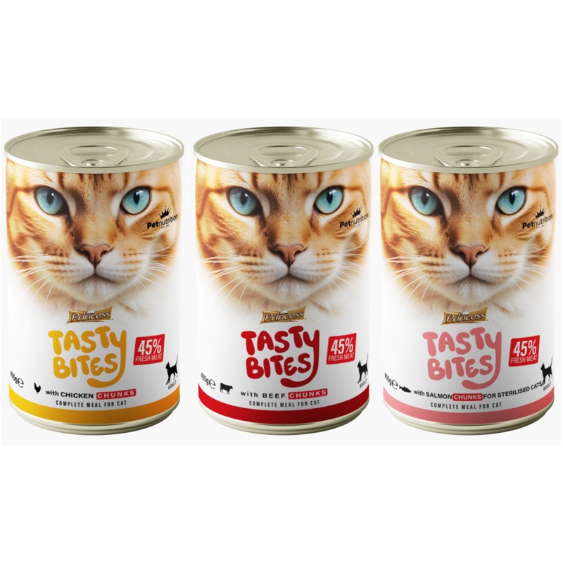 Princess Tasty Bites offers complete and nutritious wet meals, specially crafted for cats and kittens. With 45% fresh meat and high-quality ingredients, this comforting wet food provides a wholesome, highly palatable meal with 6% protein to support overall health and vitality. Available in a variety of delicious options including Chicken, Beef and Salmon, these hearty chunks burst with flavor and deliver the essential nutrients your feline friend needs.