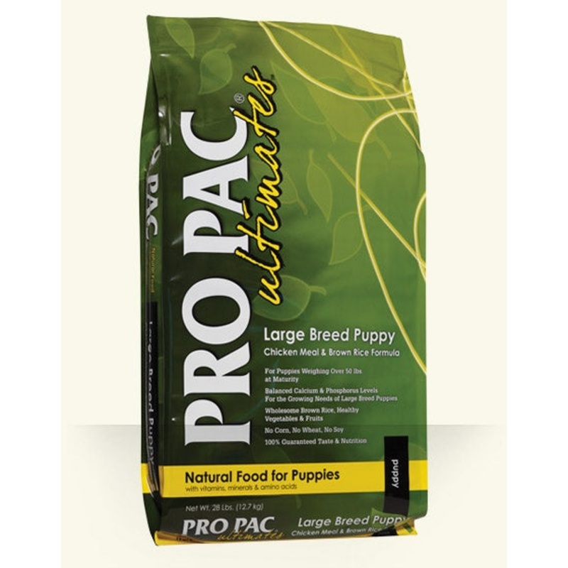 PRO PAC Ultimates Large Breed Puppy Chicken Meal & Brown Rice Formula is scientifically formulated for puppies weighing over 50 lbs. at maturity. Calcium and phosphorus levels have been formulated to support a slower growth rate which can help minimize common joint and bone problems often found in large and giant breeds. The increased level of nutrients provides extra calories for energy and growth and more protein to form muscles, organs and strong bones. PRO PAC Ultimates Large Breed Puppy Chicken Meal & Brown Rice Formula contains DHA which aids in healthy brain and eye development in puppies. Made without corn, wheat or soy, this special puppy formula provides the ultimate in canine nutrition. This antioxidant-rich formula is fortified with Vitamin A and Vitamin C along with nutrient-rich vegetables and fruits from peas, apples, blueberries, carrots, spinach and cranberries. Fibers from beets, blueberries and cranberries help overall digestion.