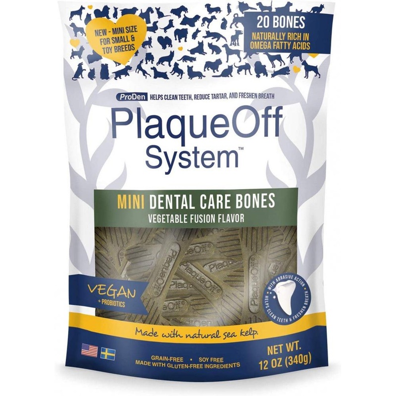 ProDen PlaqueOff Mini Dental Bones are dog chews with the PlaqueOff System which help clean plaque and tartar by abrasive action. Used daily, this natural product made with sea kelp can complement ordinary dental hygiene. Available in two tasty flavors, Vegetable Fusion and Vegetable Fusion Blueberry.
