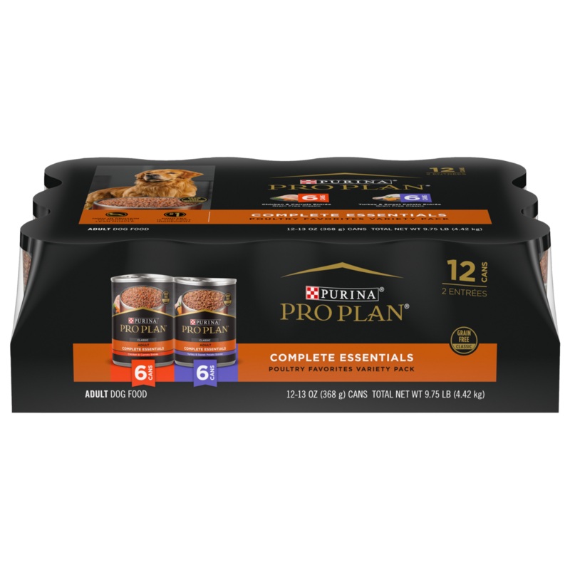 Let your dog choose between two equally delicious meal options with this Purina Pro Plan COMPLETE ESSENTIALS Grain Free adult wet dog food variety pack. Each entre features real chicken or turkey as the #1 ingredient for a taste dogs love, and both formulas offer high protein to help your dog maintain muscle mass. The tempting taste and moist, tender texture create a multisensory dining experience at mealtime. They get the tastes and textures dogs love in every bowlful, along with 23 essential vitamins and minerals to help support their overall health and wellness. This premium dog food variety pack is made with no artificial colours, flavours or preservatives, so your adult dog gets the 100 percent complete and balanced nutrition you want without the ingredients you don’t. Each pate dog food loaf formula helps support his healthy immune system while nourishing your dog’s healthy skin and coat.