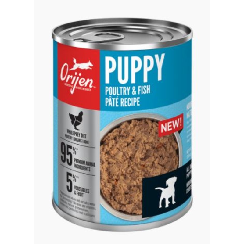 ORIJENPuppy Poultry & Fish Pt Recipe nourishes as nature intended with rich inclusions of poultry and fish that will help your puppy grow up strong and thrive. Packed with 95%* premium animal ingredients, the first five ingredients in ORIJEN Puppy Poultry & Fish Pt are fresh or raw animal ingredients including chicken and turkey. This includes succulent WholePrey ingredients like organs and bone to add a source of essential vitamins, minerals and amino acids. Feed your puppy ORIJEN Puppy Poultry & Fish Pt alone to add moisture and nourishment to their diet, or add it on top of ORIJEN Puppy or Puppy Large kibble for a nutritious, indulgent treat at mealtime.