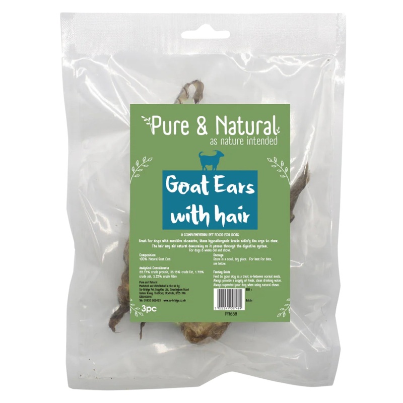 Pure & Natural Goat Ears with Hair are a nutritious, long-lasting chew made from 100% natural goat ear, providing a wholesome and highly digestible treat for your dog. The natural hair helps support digestive health by aiding in the natural deworming proce