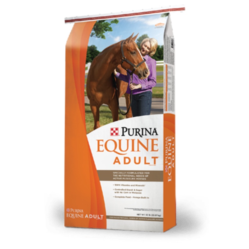 Thats why the Ph.D. Equine Nutritionists at the Purina Animal Nutrition Center formulated Purina Equine Adult horse feed to take the guesswork out of feeding your active pleasure horse. The formula was developed to ensure that your horse always gets all the nutrition he needs in one bag. Purina Equine Adult horse feed provides 100% of the required vitamins and minerals, so there is no need for expensive nutritional supplements. And because Purina Equine Adult horse feed is a complete feed with high-quality forage built in, you can feel confident that your horses entire ration is precisely balanced to meet his nutritional needs.