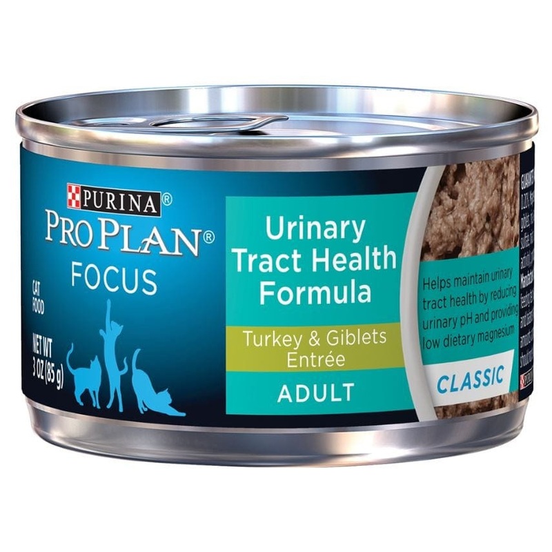 Pro Plan Focus Urinary Tract Health Formula Turkey and Giblets Entree Classic is specially designed to help maintain your cat’s urinary health by reducing urinary pH and providing low dietary magnesium. This formula is made with real turkey and an excellent taste. Every cat is special and you want the best for her. With over 50 formulas, Purina Pro Plan can help you find our best cat food to meet your cat’s unique needs. Feed adults cats 1.0 oz per pound of body weight daily, divided into two or more meals. Vary amounts according to your cat’s needs. Feed only with cat foods intended for urinary tract health. Pro Plan Focus Urinary Tract Formula should not be fed to pregnant or nursing cats or to kittens. For your pet’s health, see your veterinarian regularly. Refrigerate unused portion.
