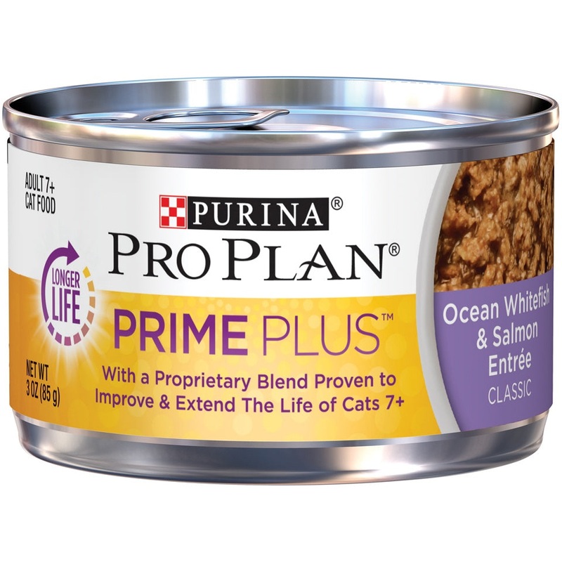 Serve your feline friend Purina Pro Plan Prime Plus Adult 7+ Ocean Whitefish & Salmon Entree Classic wet cat food, with real ocean whitefish as the #1 ingredient, and watch her enjoy every bite to the bottom of her bowl. Prime Plus includes a proprietary blend proven in a 9-year study to improve and extend the lives of cats age 7+ (findings based on cats exclusively fed a complete diet with the blend vs. cats fed the complete and balanced diet alone). Our formula also contains key nutrients to support lean muscle mass, strong immune system, healthy skin and improved microflora for a balanced digestive system.