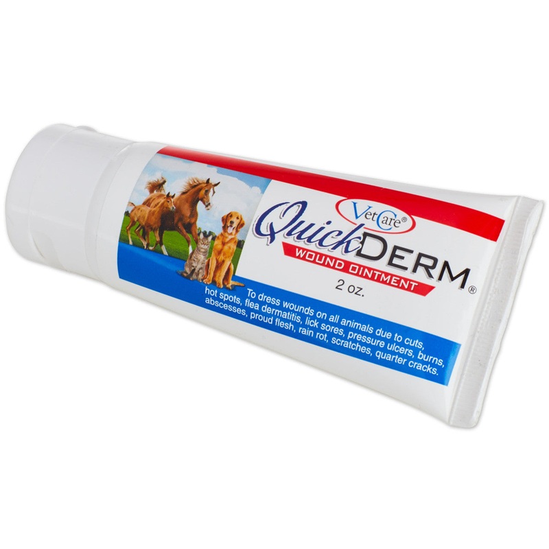 The VetCare Quickderm Wound Ointment for Dogs Cats and Horses adheres to wounds to retain moisture while treating cuts, hot spots, flea irritations, and more. This wound treatment works on dogs, cats, and horses and has a completely non-toxic formulation t