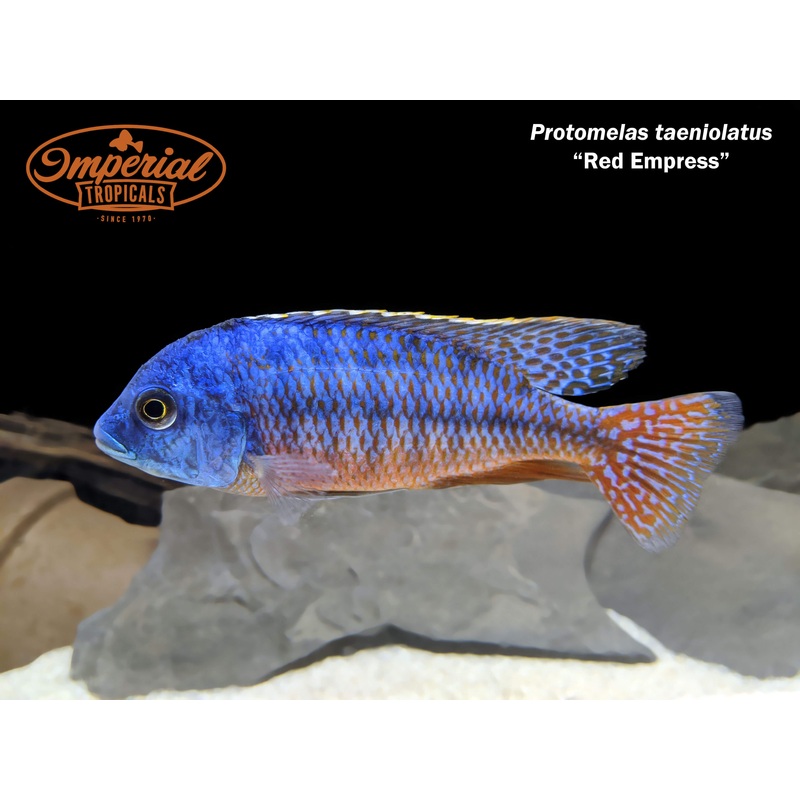 Remarks: The Red Empress cichlid (Protomelas taeniolatus) is the perfect addition to any Peacock or Hap tank. Their bright red bodies and blue-green faces are unmatched in this part of the world. These Haps are opportunistic feeders in the wild and will happily take anything offered in captivity.