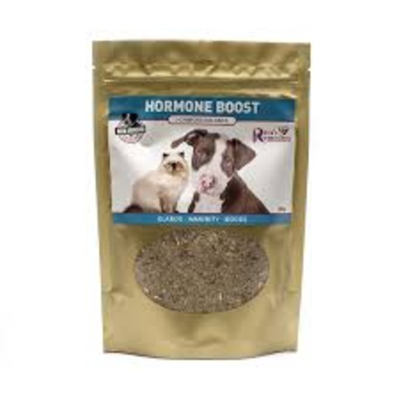 Ingredients:A proprietary blend of Ashwagandha, Chaste Berry, Kelp, Licorice Root, Raspberry Leaf.Directions:The recommended daily dosage is based on your dogs weight: Up to 10kg - 1/4 tsp. 10 - 25 kg - 1 tsp. 25 -50 kg - 2 tsp. Over 50 kg - 1 tbsp. Hormon