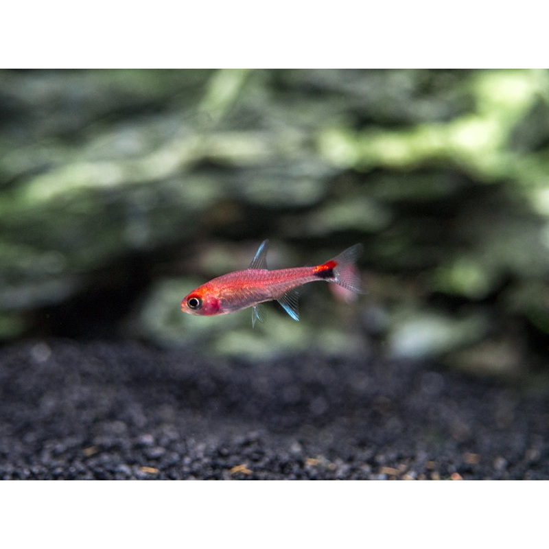 TheRuby Tetra typically occupies the top and middle level of the water column, although it can often be seen swimming and feeding in the middle and bottom levels as well. It is typically safe with other peaceful, small fish. Unlike many tetras, it is shoaling rather than schooling. Due to its extra small size, it can be viewed as similar to microrasboras as far as its compatibility with dwarf shrimp. Larger, peaceful invertebrates can also make good tankmates. The Ruby Tetra must be kept ingroups of at least 6 or more. Its natural habitat contains slightly acidic water rich in tannins and leaf litter. It requires very clean water to thrive and it will display optimal coloration and health in a planted aquarium with dark, sandy substrate and slow-flowing water, especially where floating plants are present. It should not be kept with overly boisterous tankmates that will out-compete it during feeding.