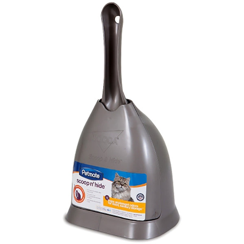 Finally a way to keep the litter scoop both handy and hidden! Petmate Scoop 'N' Hide is a clean and efficient litter scoop with a custom designed storage unit. The perfect solution on where to keep the litter scoop in between box cleanings. Hinged stand di