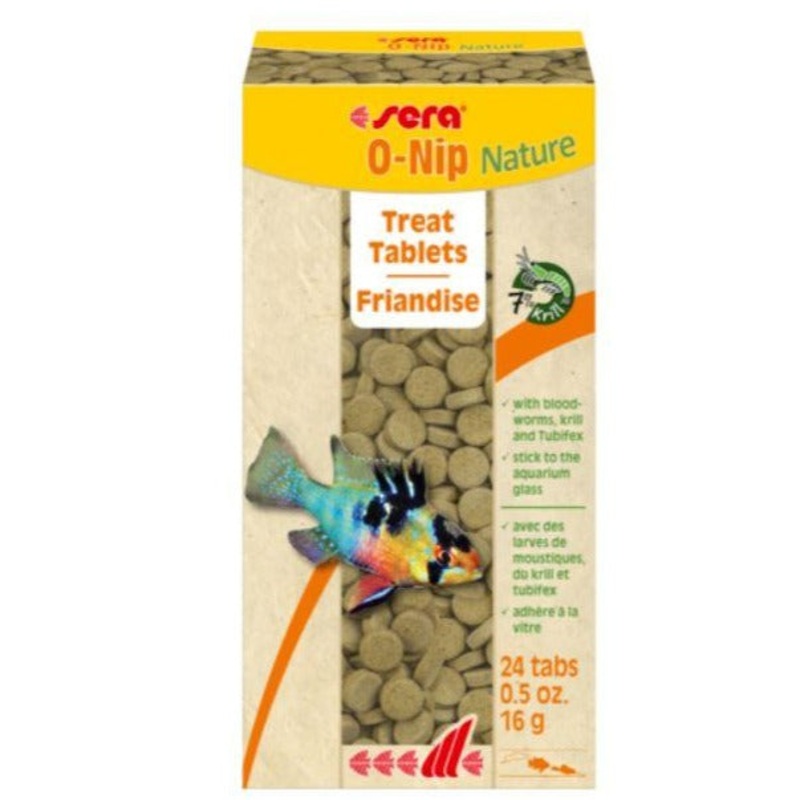 sera O-Nip Nature is the treat without dyes and preservatives consisting of gently manufactured tabs that can be stuck to the aquarium glass by slight finger pressure. This allows watching even shy fish while they are eating.