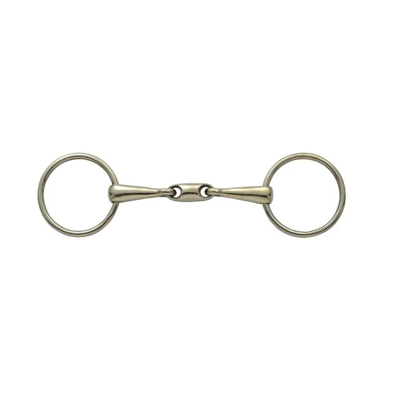 Item code: 6201This is a copper alloy lozenge link training bit meaning that there is no nutcracker action. Instead, a gentle round link between the two arms of the bit folds comfortably over the tongue.Mouth: 18mmRing size: 65mm