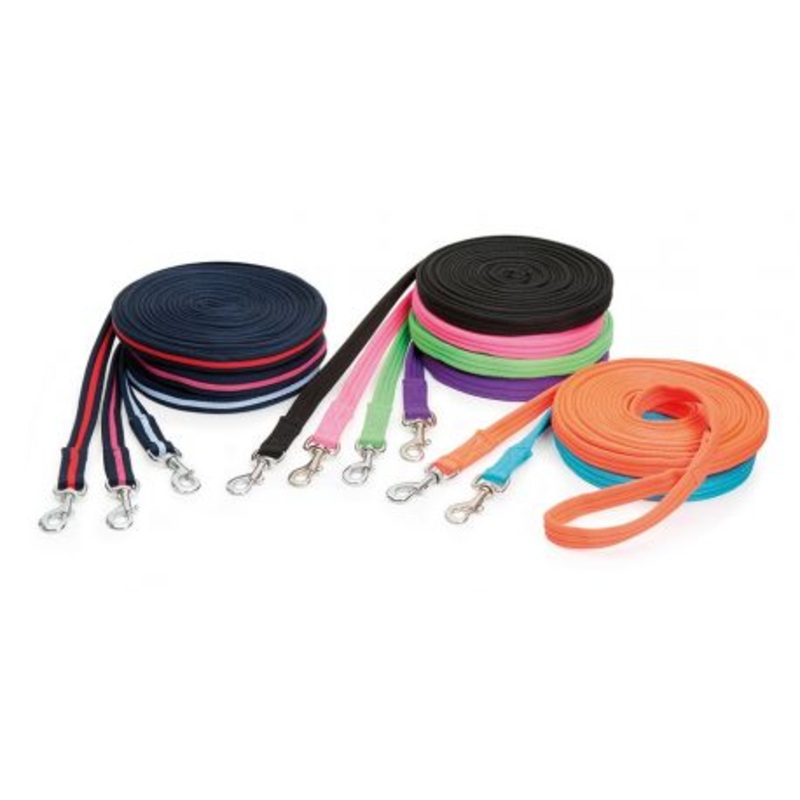 Soft tubular nylon web lunge line featuring a swivel trigger clip at one end and hand loop at the other.
