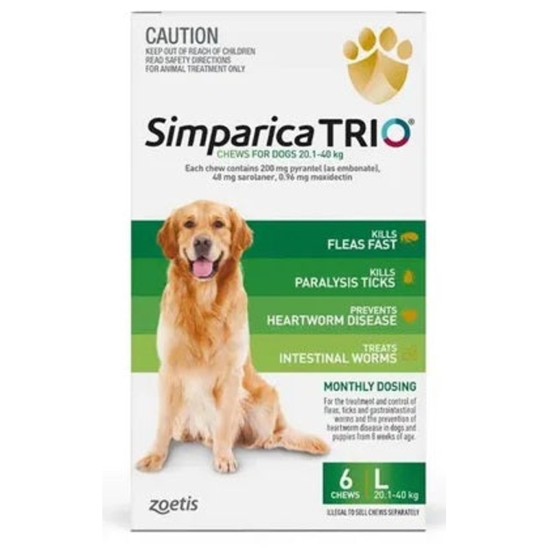 Simparica Trio provides triple protection against fleas and ticks, intestinal worms and deadly heartworm disease all in a tasty monthly chew.Simparica Trio contains a specially optimised trio of ingredients for proven efficacy including the ingredient moxi