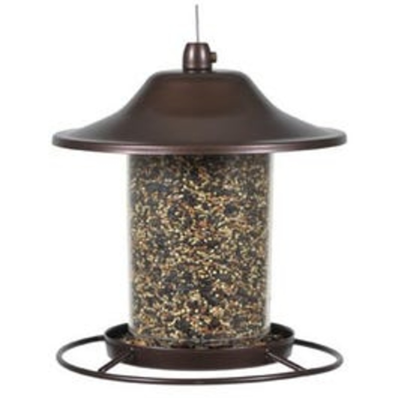9.25", Small Panorama Bird Feeder, Perch Design Allows Birds To Feed From Multiple Angles, Patented Sure-Lock Cap System Helps Keep Squirrels Out, Rustic Brown Finish, For Use With Any Type Of Seed, 2 LB Capacity.
