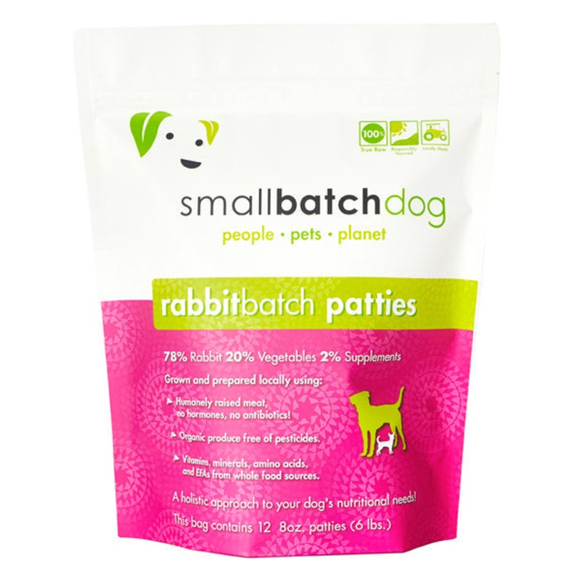 78% humanely raised and harvested rabbit, 20% organic produce, 2% natural supplements