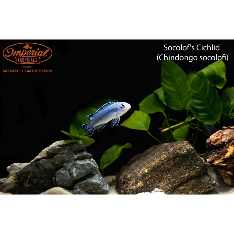 Remarks: Chindongo socolofi was previously classified as Pseudotropheus socolofi. The juvenile stripe pattern fades with age as the fish become solid light-blue with darker fins.Scientific Name: Chindongo socolofiCommon Name: Socolof's CichlidMax Size: 5"p