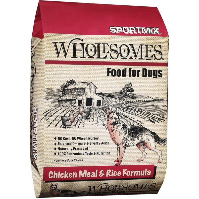 SPORTMiX Wholesomes Chicken Meal & Rice Formula is designed for dogs needing a high energy food from a single source of high-quality protein. Wholesomes Chicken Meal & Rice Formula is made without high-moisture protein sources or common grains like corn, wheat or soybeans. Wholesomes Chicken Meal & Rice Formula nutritionally balances Omega-6 and Omega-3 fatty acids to promote good skin and hair coat. The addition of natural vegetable fibers help support good digestion. SPORTMiX Wholesomes Chicken Meal and Rice Formula supplies your dog with a naturally preserved, 100% complete and balanced diet for a healthy, active life. Available in 40 and 16.5 lb. bags. Simply a wholesome alternative to common dog food formulas.