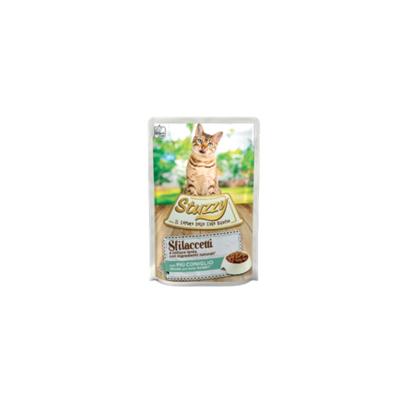 Shreds with rabbit slow cooked with natural ingredients Slow-cooked to enhance the inviting flavour these are Stuzzy Shreds with Rabbit: a complete product rich in flavour and natural ingredients. Turn your cats mealtime into a moment of pure pleasure. Com