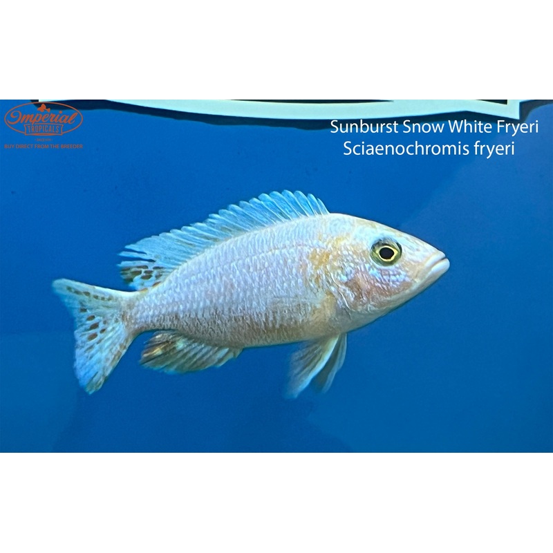 Remarks:The Sunburst Snow White Fryeri is a truly stunning fish with the males displaying platinum bodies accented by vibrant orange hues in their fins. Occasionally, the bodies of males might also show some of this orange hue among their white, metallic s